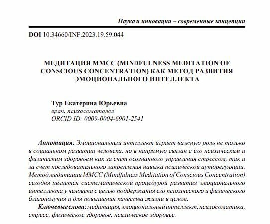 Abstract: emotional intelligence plays an important role not only in the social development of a person, but is also directly related to his mental and physical health, both through conscious stress management and through consistent consolidation of the skill of mental autoregulation. The MMCC (Mindfulness Meditation of Conscious Concentration) meditation method is today a systematic procedure for developing emotional intelligence in a person in order to maintain his mental and physical well-being and to improve the quality of life in general.