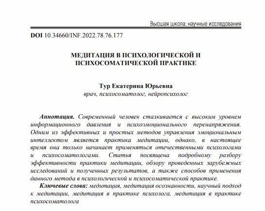 Современный человек сталкивается с высоким уровнем информационного давления и психоэмоционального перенапряжения. Одним из эффективных и простых методов управления эмоциональным интеллектом является практика медитации, однако, в настоящее время она только начинает применяться отечественными психологами и психосоматологами. Статья посвящена подробному разбору эффективности практики медитации, обзору проведенных зарубежных исследований и полученных результатов, а также способов применения данного метода в психологической и психосоматической практике.Ключевые слова